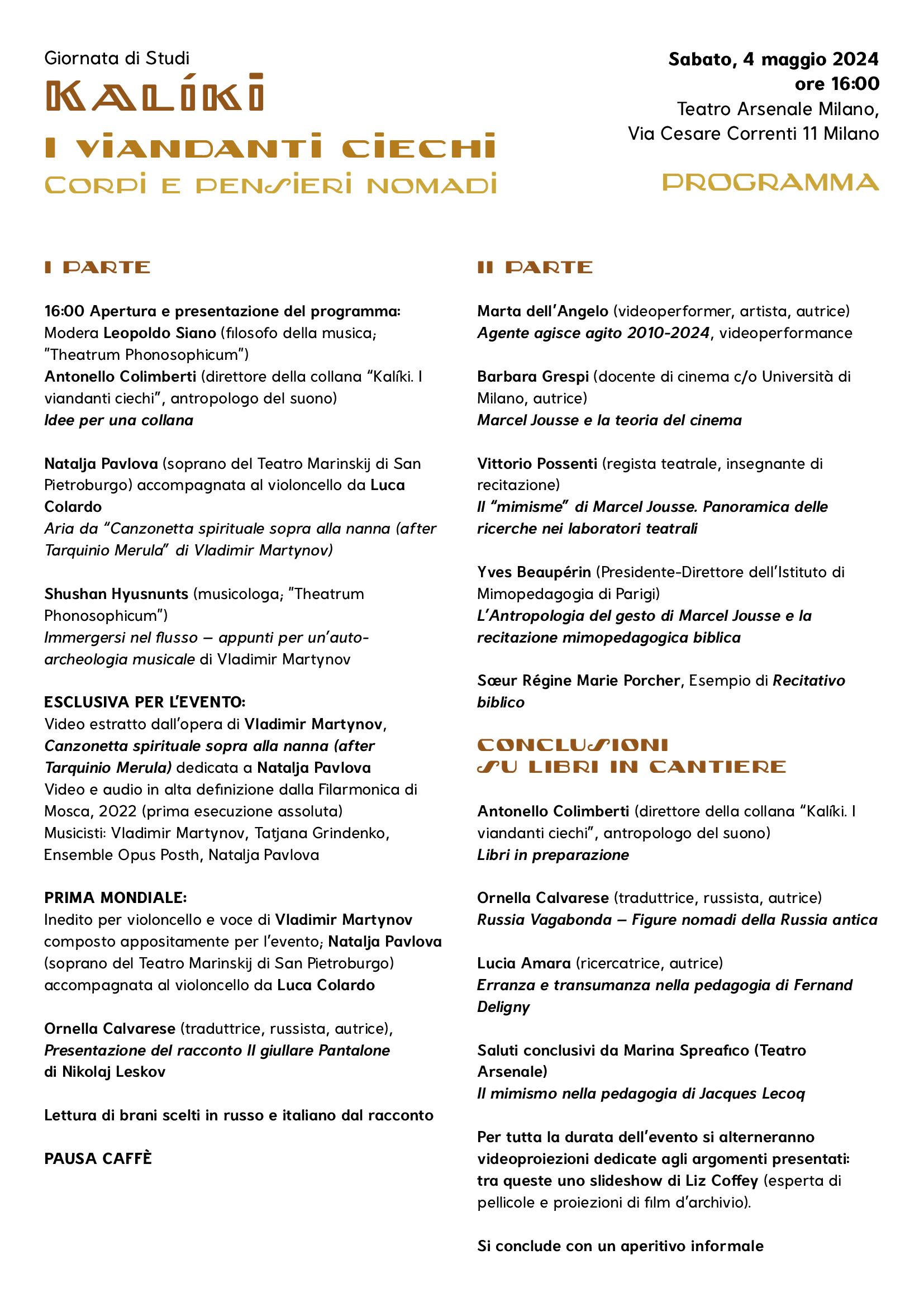 Ad alternarsi sul palco del Teatro Arsenale nomi illustri del mondo della ricerca, dell’arte e della musica nazionali e internazionali: il direttore dell’Istituto di Mimopedagogia di Parigi Yves Beaupérin; la soprano del Teatro Marinskij di San Pietroburgo Natalja Pavlova (che in prima mondiale eseguirà un’aria composta in esclusiva per l’evento da Vladimir Martynov). E ancora, la musicologa Shushan Hyusnunts; la videoperformer Marta Dell’Angelo; la docente di storia e critica del cinema Barbara Grespi; la ricercatrice Lucia Amara e il regista teatrale e insegnante di recitazione Vittorio PossentiLe attività della giornata ripercorreranno i temi e prenderanno avvio dagli scritti di Martynov, Jousse e Leskov pubblicati nella collana Kalíki, edita da Mimesis Edizioni. I Kalíki, che danno il nome alla giornata e alla suddetta collana, sono bardi erranti del Medioevo russo che si muovevano a piedi cantando l’epos popolare; le ricerche degli studiosi vogliono portare alla luce dei saperi sommersi, di confine, diversi e antichi, vicini più alle modalità dello stile orale che a quelle della scrittura. L’intento è di offrire ad un pubblico ampio e non specialistico una selezione di testi che non hanno trovato collocazione nell’universo accademico perché portatori di una ricerca sommersa, fuori dalle forme definite e canonizzate delle discipline universitarie. Testi di confine, tra saperi diversi e antichi, vicini più alle modalità dello stile orale che a quelle della scrittura. Anche per questo, la collana Kalíki si dà come obiettivo di indagare la categoria del nomadismo nelle sue declinazioni più ampie: non solo condizione antropologica di chi non risiede in un dato luogo, ma condizione di chi supera le forme destrutturandole, di chi si esprime vagando e nutre un immaginario dell’erranza che genera una sensibilità alternativa e ci racconta un’altra versione della storia.