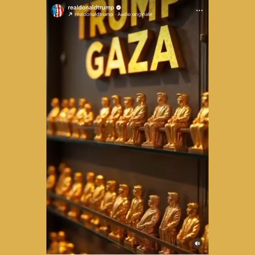 Senza ulteriormente dilungarci sull’oscenità delle immagini nel loro complesso, né soffermarci sulle potenzialità sempre più ampie nell’uso dell’IA, ci catalizza soprattutto il fotogramma dei souvenir d’oro che riproducono il presidente americano. E appunto ci viene in mente Freud: quale inconscio starebbe dietro il sogno trumpiano di una celebrazione del genere? Misteriosi complessi di inferiorità? Ambizioni irrefrenabili da salvatore della patria? Manie di pubblica sottomissione? Oltre al’Io (l’essere coscienti) e all’Es (azioni di pulsioni inconsce che, fin dall’infanzia, agiscono per raggiungere il piacere), Trump ce l’avrà un Super-Io (quella forza inconscia dentro di noi che censura alcuni desideri dell’Es impedendone la realizzazione)? Avrà cioè dei vincoli morali? Dei principi non negoziabili, oltre alla propria innegabile volontà di potenza?