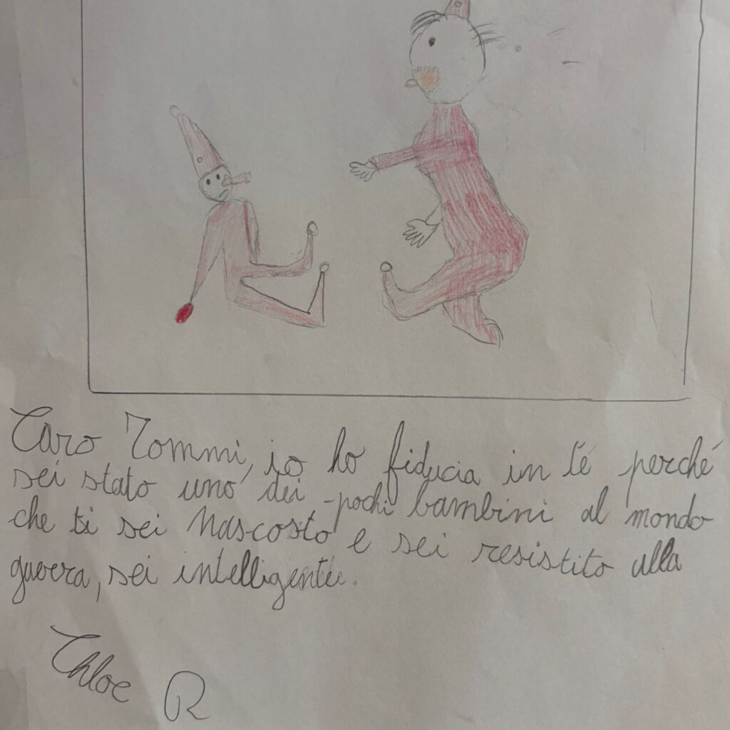 Mentre camminiamo verso l’uscita tra lunghi corridoi, ci viene mostrato, attaccato alla parete, un disegno realizzato da un bambino: raffigura la storia di Tommy, un bimbo ebreo raffigurato mentre viene nascosto dai giusti e si salva. Dalia Gubbay e Diana Segre ci raccontano che si tratta di una storia vera e che, nella realtà, quel bambino purtroppo non è mai tornato a casa.