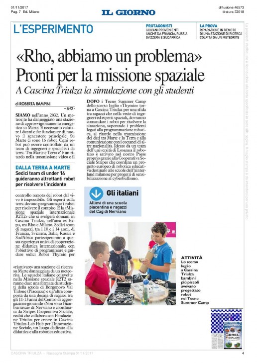 Basta pallone e rubabandiera “L’estate dei bimbi è coi robot” Thymio, il robot sensibile che insegna a non fare i bulli IL CAMPUS “Base, c’è un problema” Gli studenti nervianesi in missione spaziale L’ESPERIMENTO… “Rho, abbiamo un problema” Pronti per la missione spaziale Sport, Musica e street food, riapre l’Expo Il Ritorno di Experience Il Parco Experience riapre e raddoppia.Musica, sport e mongolfiere. In Copertina CAMPUS…Inglese&Compiti In Copertina CAMPUS…Coding&Computer In Copertina CAMPUS…Teatro&Musical In Copertina CAMPUS…Fotografia&Cinema In Copertina CAMPUS…Circo&Acrobazie In copertina CAMPUS In Copertina CAMPUS “Quest’estate voglio fare…” Spettacoli,mostre e anche una pista da sci. L’albero della vita torna a illuminarsi e l’area Expo riapre alla popolazione. E…state in festa a Cascina Triulza “Children Park” In Cascina Triulza Appuntamenti&Laboratori in Triulza “Life Bambini” I robot a Cascina Triulza E-State in Triulza Un Robot per conoscere le farfalle Appuntamenti in Cascina Triulza Apre Children Park. Mostrare ai piccoli un modo di essere “Sociale” In Cascina ” Spazi sensoriali e multimediali Piccoli naturalisti o scienziati in erba? Scienze naturali e robotica? Si va a lezione in cascina. Parla Igor Guida Responsabile di Stripes ” Un importante percorso nelle scuole della nostra zona” Centro estivo dedicato alla robotica “Bata pallone e rubabandiera” L’estate dei bimbi è coi robot. Thymio,il robot sensibile che insegna a non fare i bulli. “CAMP” Tecno Summer Camp Thymio&Esperimenti Laboratori gratuiti per i bambini “Natur Art” Creare Mosaici “Children Park ” Laboratori Data Lab “laboratorio di robotica collaborativa” Life Bambini “Weekend in Cascina Triulza” Bambini ” OpenLab make it” Sfide con i Robot o laboratori sulle api? Laboratori “Children Park” Parco EXPerience “Bambini invitati a Cascina Triulza” Parco EXPerience: Italia sul maxischermo Laboratori “Children Park” Children Park Children Park Laboratorio 0-12 “LO STRAORDINARIO MONDO DELLE API” THIMIO COM…BATTE IL BULLISMO Info: digituslab@pedagogia.it