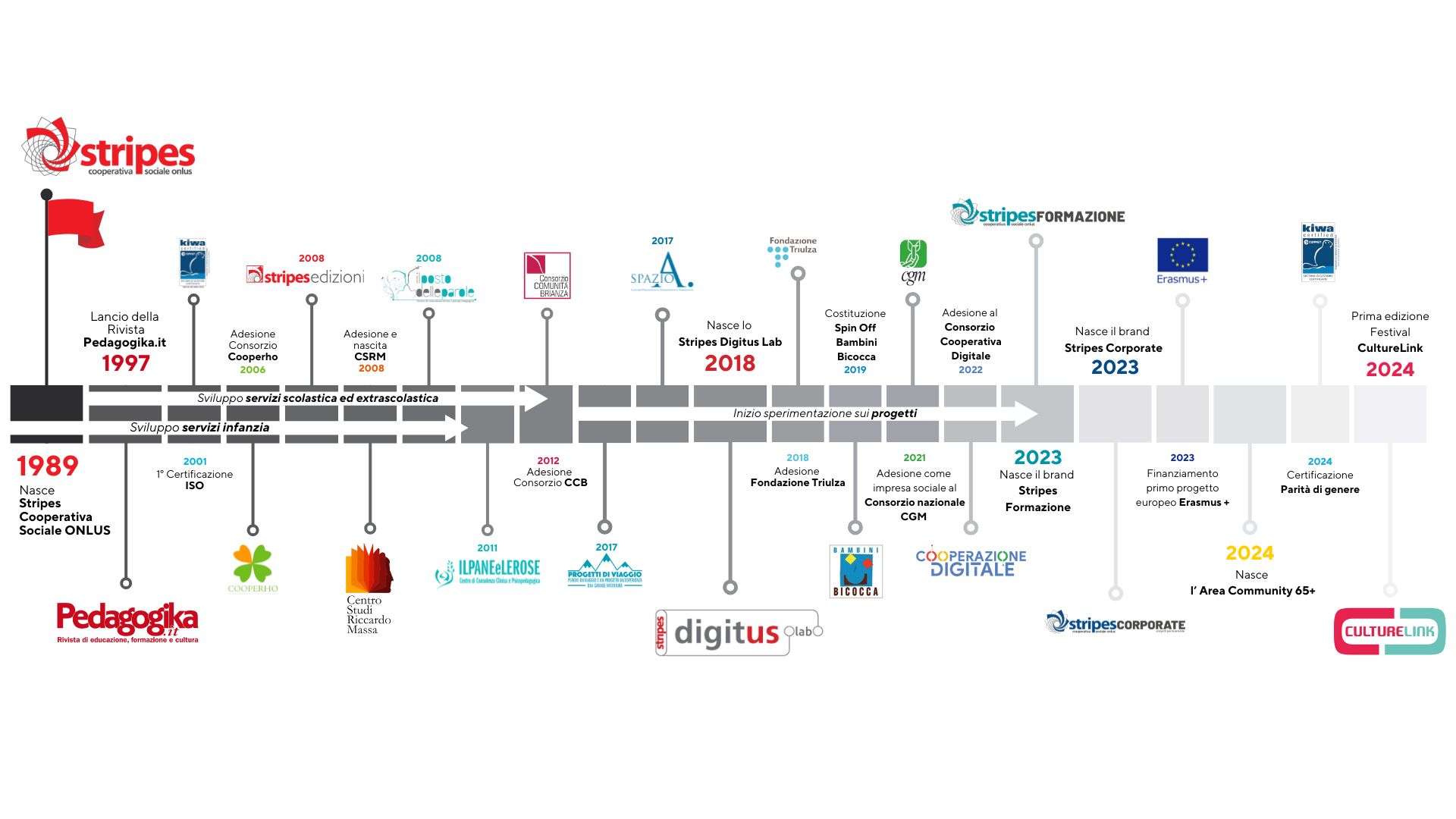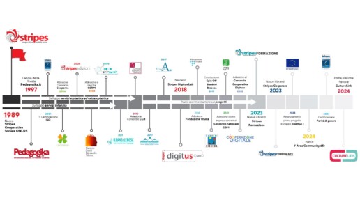 La storia di Stripes si è inizialmente caratterizzata per la gestione dei servizi per la prima infanzia; successivamente, negli anni 2000, la Cooperativa ha sviluppato competenze anche negli ambiti formativi, scolastici ed extrascolastici gestendo servizi di educativa domiciliare, scolastica e di strada. Attualmente Stripes si sta specializzando sul fronte dell’innovazione tecnologica coniugata, soprattutto, alle pratiche educative anche grazie allo Stripes Digitus Lab, il Centro internazionale di ricerca sulla robotica educativa e le tecnologie digitali nato nel 2018 all’interno di MIND Milano.