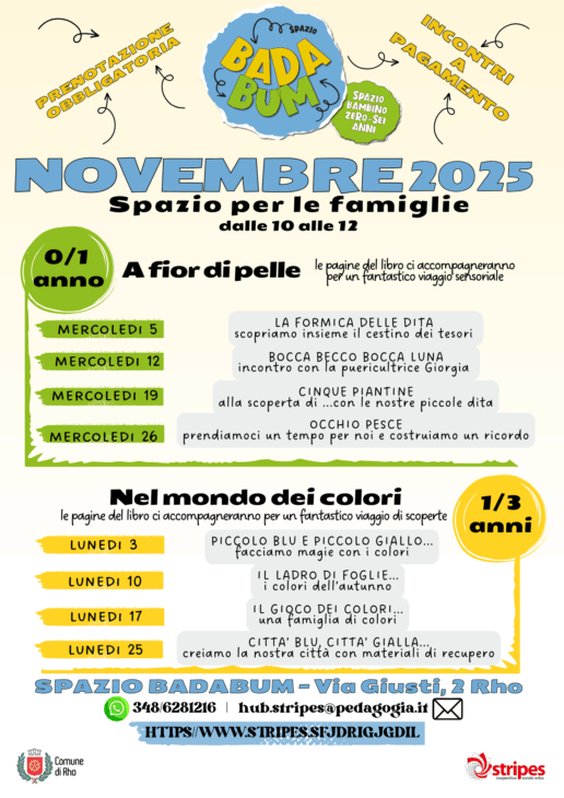 Bada Bum è uno spazio aperto e libero dedicato all’infanzia, uno spazio dove co-costruire insieme al territorio, alle famiglie e ai bambini della città di Rho un ambiente accogliente e stimolante, che prenda forma anche a seconda dei bisogni e dei desideri di ognuno.