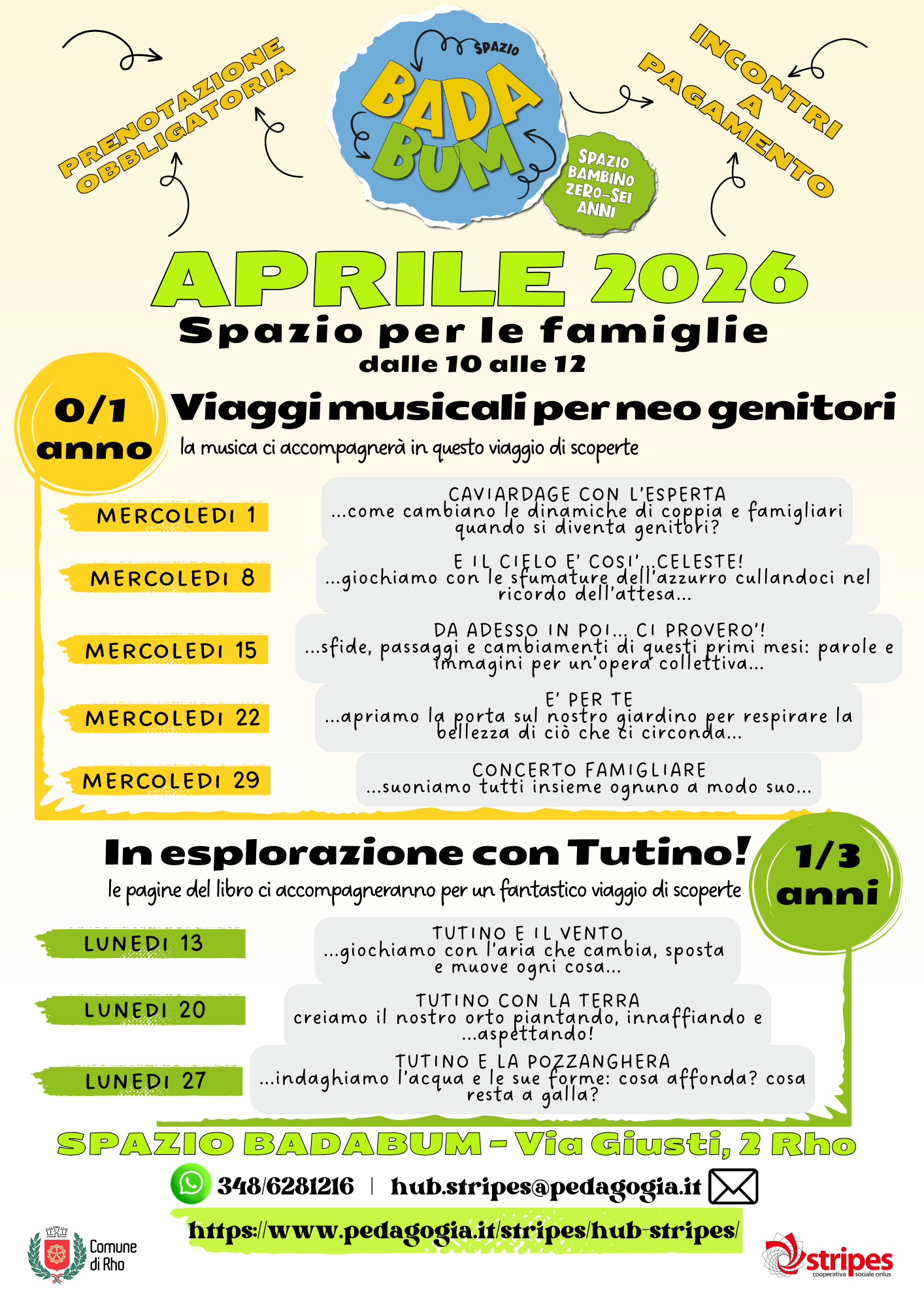 Vi chiediamo gentilmente, per dare la possibilità a più famiglie di partecipare agli incontri, di prenotare 2 appuntamenti mensili per fascia di età sui 4 disponibili.