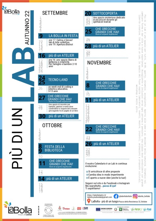 Più di un Lab è uno spazio per tutti, 0-99, aperto, dinamico, accogliente. Aperto alle idee e ai desideri della comunità. Dinamico nel cambiare forma e dar vita a nuove esperienze. Accogliente e inclusivo verso ogni persona e pensiero. Una piazza dove condividere con grande libertà creativa. Con Più di un Lab, lo spazio del Foyer ospita laboratori, eventi, mostre, incontri, animazioni e proposte culturali, workshop e molto altro. Su questa pagina troverete tutte le nostre proposte alle quali partecipare.