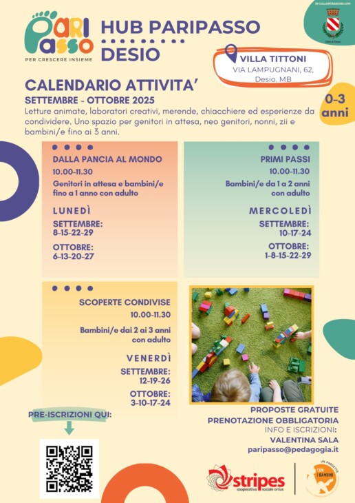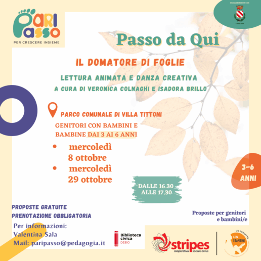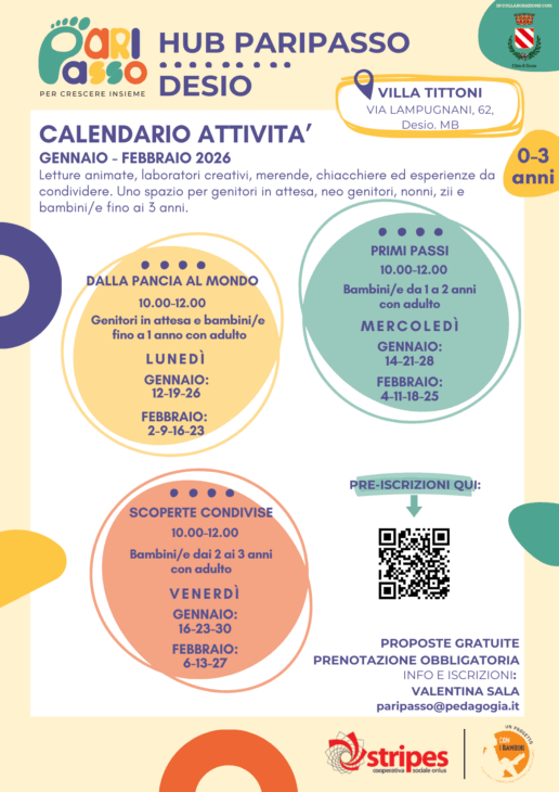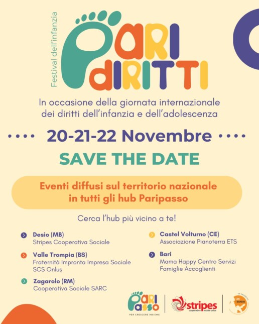 “PARIPASSO, per crescere insieme” finanziato da Impresa Sociale Con I Bambini è un progetto nazionale con capofila Cooperativa Stripes Onlus. Le attività rivolte alla fascia 0-6 anni, con un’attenzione ai primi 1000 giorni di vita, prevedono la realizzazione di percorsi territoriali, caratterizzati da interventi multidisciplinari in grado di accompagnare le famiglie e i bambini in azioni di cura, educazione e inclusione. PARIPASSO viene avviato nei territori di Alta Val Trompia (BS), Bari, Castel Volturno (CE), Desio, Roma.