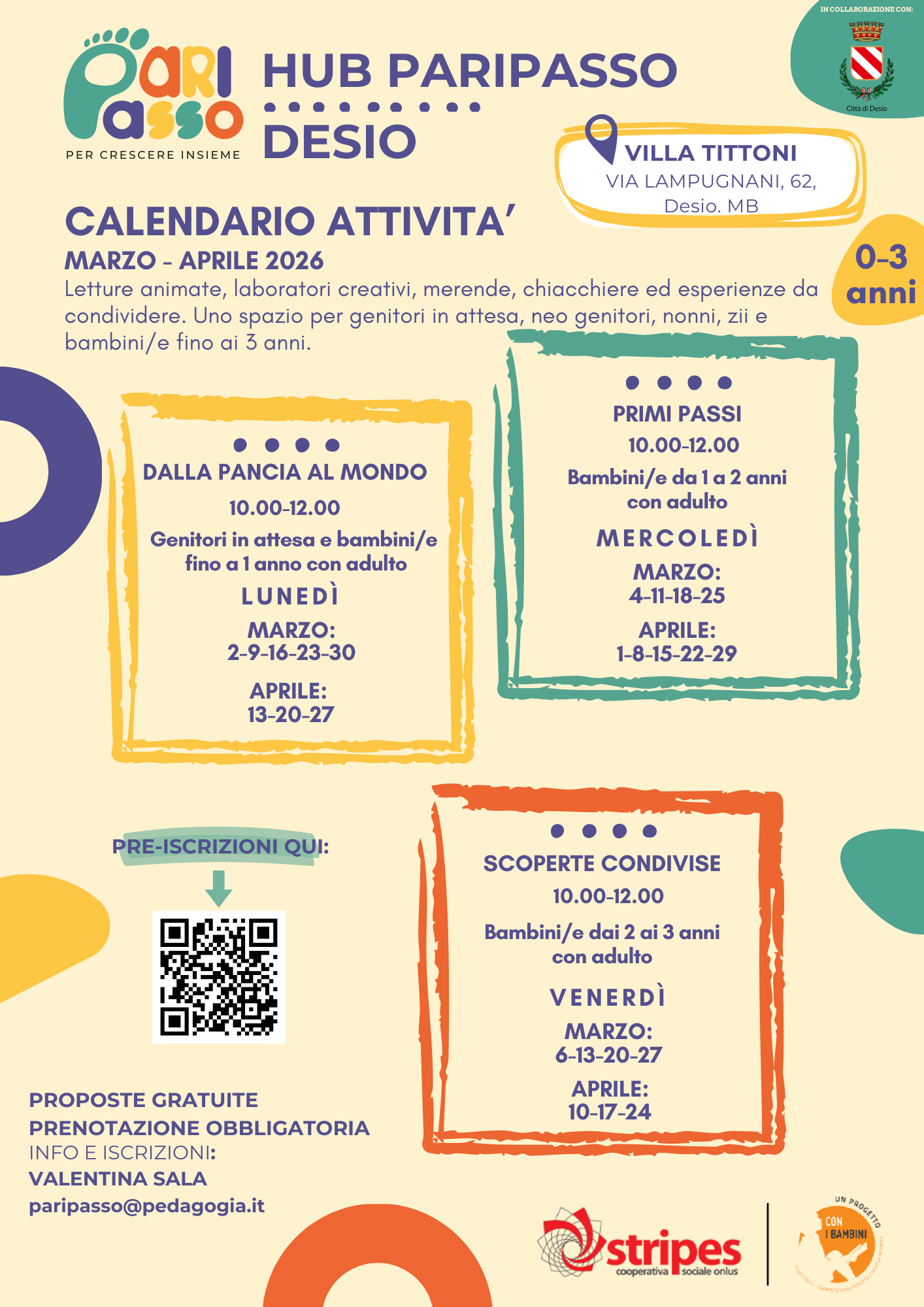 “PARIPASSO, per crescere insieme” finanziato da Impresa Sociale Con I Bambini è un progetto nazionale con capofila Cooperativa Stripes Onlus. Le attività rivolte alla fascia 0-6 anni, con un’attenzione ai primi 1000 giorni di vita, prevedono la realizzazione di percorsi territoriali, caratterizzati da interventi multidisciplinari in grado di accompagnare le famiglie e i bambini in azioni di cura, educazione e inclusione. PARIPASSO viene avviato nei territori di Alta Val Trompia (BS), Bari, Castel Volturno (CE), Desio, Roma.