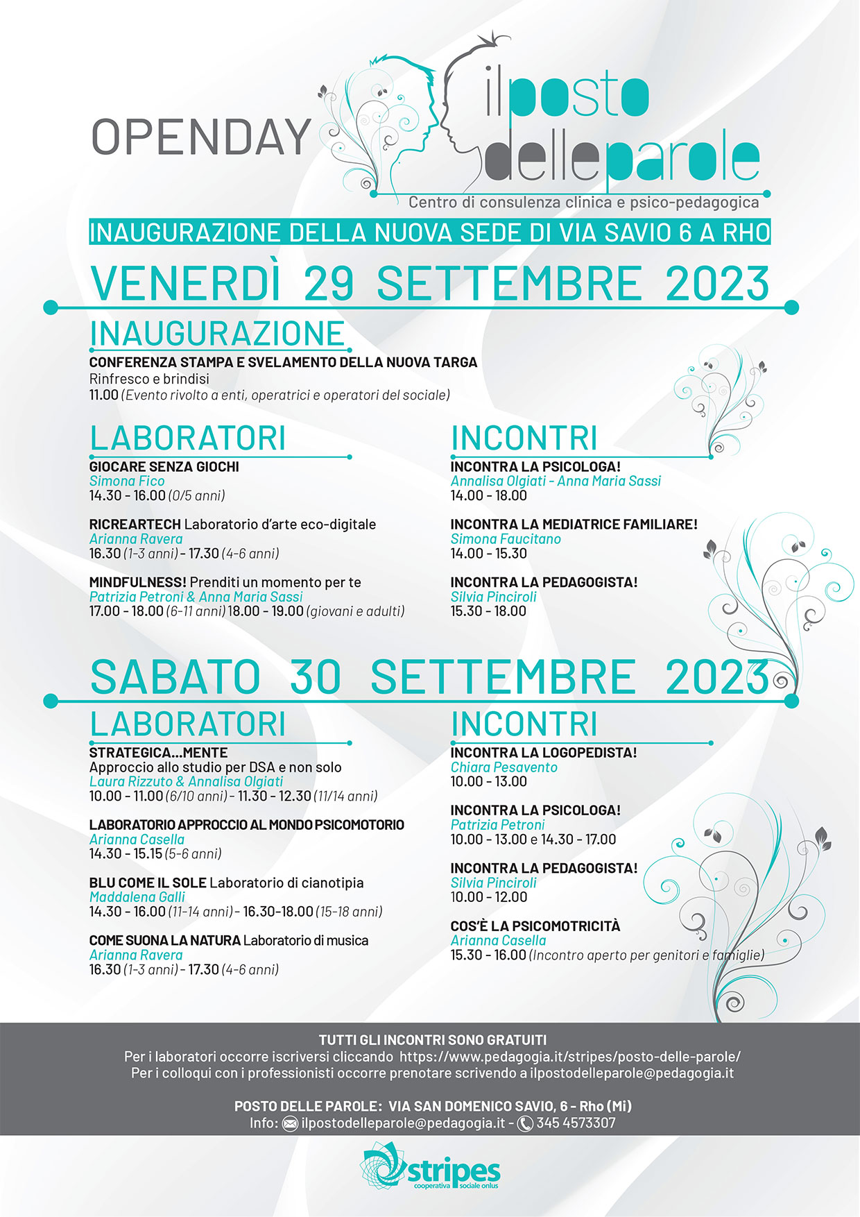 Con lo spostamento nella nuova sede di via Savio 6 a Rho (MI), il Centro psico-pedagogico di aiuto alla famiglia Il Posto delle Parole ha deciso di cambiare forma per diventare qualcosa di più …molto di più!