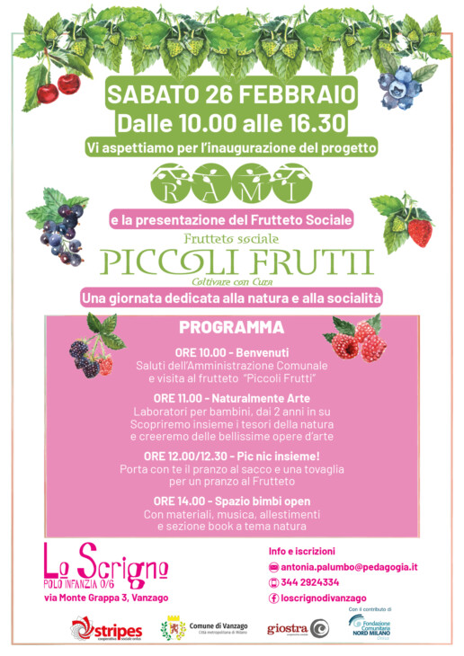 Negli ultimi giorni passando vicino al Polo per l’infanzia e la famiglia “Lo Scrigno” o parcheggiando in via Magistrelli, gli abitanti di Vanzago hanno visto – al di là della cancellata – il giardino della struttura per l’infanzia riempirsi di piante e strani supporti di sostegno. E’ il frutteto sociale “Piccoli Frutti” che sta nascendo nel giardino de “Lo Scrigno” grazie al progetto RAMI – Rigenerare l’Ambiente in Modo Inclusivo, promosso da Cooperativa STRIPES, Cooperativa Giostra e Comune di Vanzago con il contributo di Fondazione Comunitaria Nord