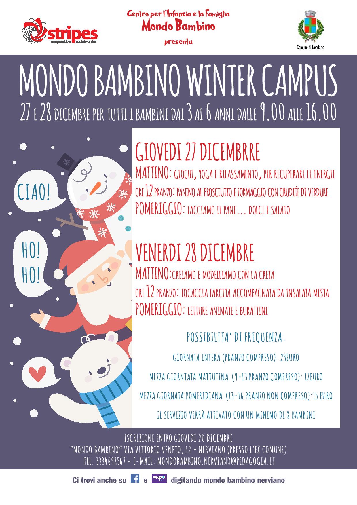 Vi aspettiamo al Winter Campus di Mondobambino a Nerviano il 27 e il 28 dicembre per tutti i bambini dai 3 ai 6 anni dalle 9:00 alle 16:00.